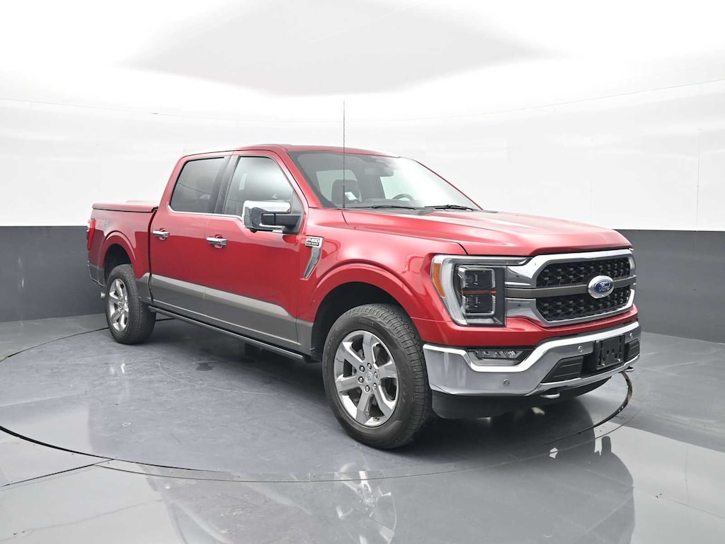 EQUIPMENT GROUP 601A HIGH Radio: B&O Unleashed Sound System by Bang & Olufsen, HD Radio and 18 speakers including subwoofer, Tires: 275/60R20 OWL Automatic Transmission, 275/65R18 OWL all-terrain spare tire, Power-Deployable Running Boards, Replaces step bar, Wheels: 20 Machined-Aluminum, light Caribou painted pockets and King Ranch ornament, Bed Utility Package, BoxLink, 4 premium locking cleats, LED Box Lighting, Tailgate Step w/Tailgate Work Surface, Power Tailgate, Multi-Contour Driver & Passenger Seats, Active Motion, KING RANCH CHROME APPEARANCE PACKAGE 2 chrome front tow hooks and tailgate applique, Chrome Door Handles w/Body-Color Strap, Front & Rear Chrome Bumpers, Bright Belt Moldings, Tires: 275/60R20 OWL Automatic Transmission, 275/65R18 OWL all-terrain spare tire, Wheels: 20 Chrome-Like PVD, King Ranch wheel ornament, Chrome Skull Caps on Exterior Mirrors, TWIN PANEL MOONROOF, FX4 OFF-ROAD PACKAGE: Off-Road Tuned Front Shock Absorbers, Skid Plates, fuel tank, transfer case and front differential, Monotube Rear Shocks, Rock Crawl Mode, 4x4 FX4 Off-Road Bodyside Decal, Hill Descent Control, Electronic Locking w/3.31 Axle Ratio, Tray Style Floor Liner, TOW TECHNOLOGY PACKAGE smart trailer tow connector and BLIS w/trailer tow coverage where BLIS is available, 360 Degree Camera, trailer reverse guidance, Pro Trailer Backup Assist, ENGINE: 3.5L V6 ECOBOOST, TOUGH BED SPRAY-IN BEDLINER, RAPID RED METALLIC TINTED CLEARCOAT, EXTENDED RANGE 36 GALLON FUEL TANK, TRANSMISSION: ELECTRONIC 10-SPEED AUTOMATIC selectable drive modes: normal, ECO, sport, tow/haul, slippery, deep snow/sand and mud/rut (STD).